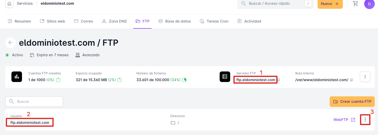 Les dades per accedir via FTP les trobarem a l'àrea de client, dins de l'apartat FTP del panell de gestió de l'allotjament. Per accedir-hi, des de la nostra àrea de client, prémer l'opció “Hosting i Correu” i fer clic sobre el domini que tingui el pla d'allotjament del qual volem exportar la còpia. Un cop dins, a la part superior, podrem accedir a l'apartat “FTP”.