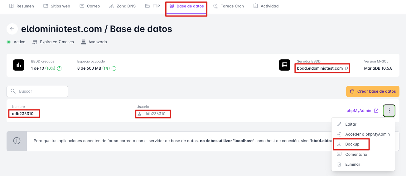 O fins i tot, obtenir les credencials, com el “Servidor”, “Nom”, “Usuari” i “Contrasenya” (La contrasenya podràs veure-la/modificar prement “Editar” en el botó de més opcions) per utilitzar-les per accedir mitjançant un programa extern com Workbench MySQL.