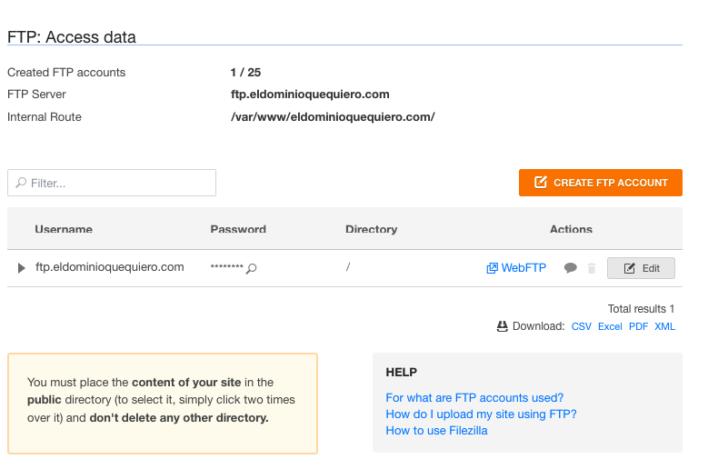 If you want to delete or edit the configuration parameters of an FTP user, you can do so from the FTP section. From there, you can edit the directory assigned to that user and the FTP access password.