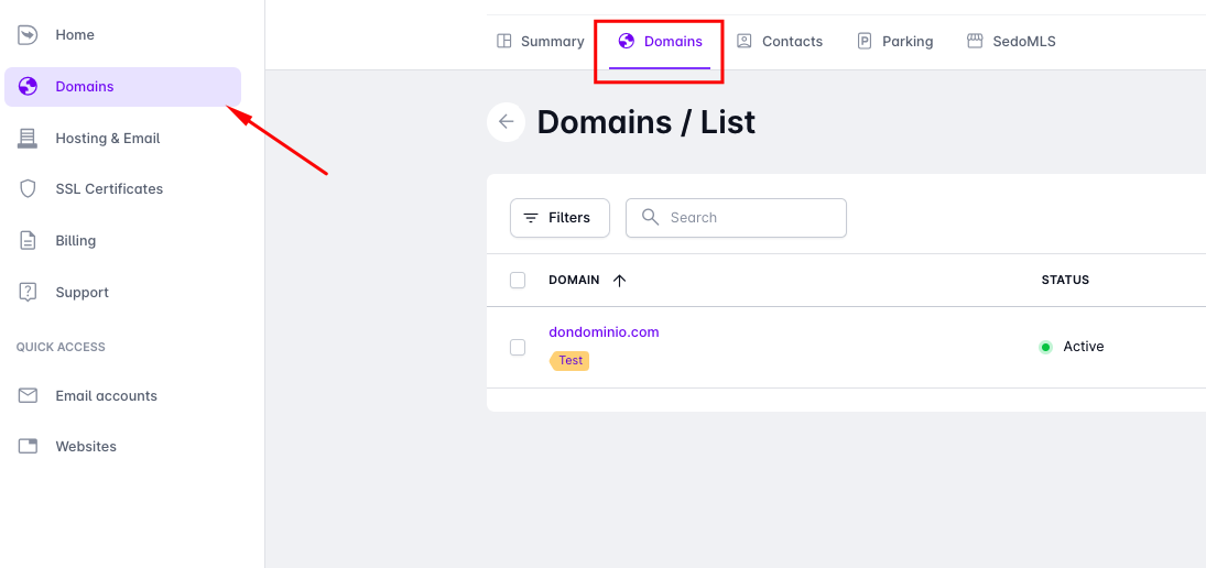 1. Access the Domain List by clicking Domains - Domains from your client area.
