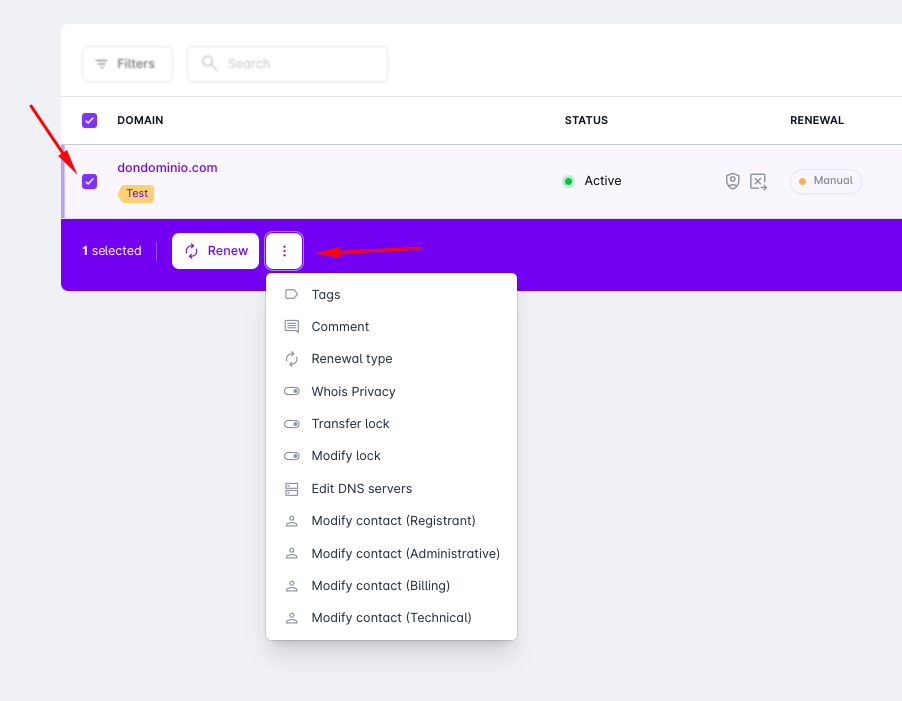 1. Select the domains you wish to make changes to by checking the box next to each one and using the three dots at the end of the list, choose the action to be taken.