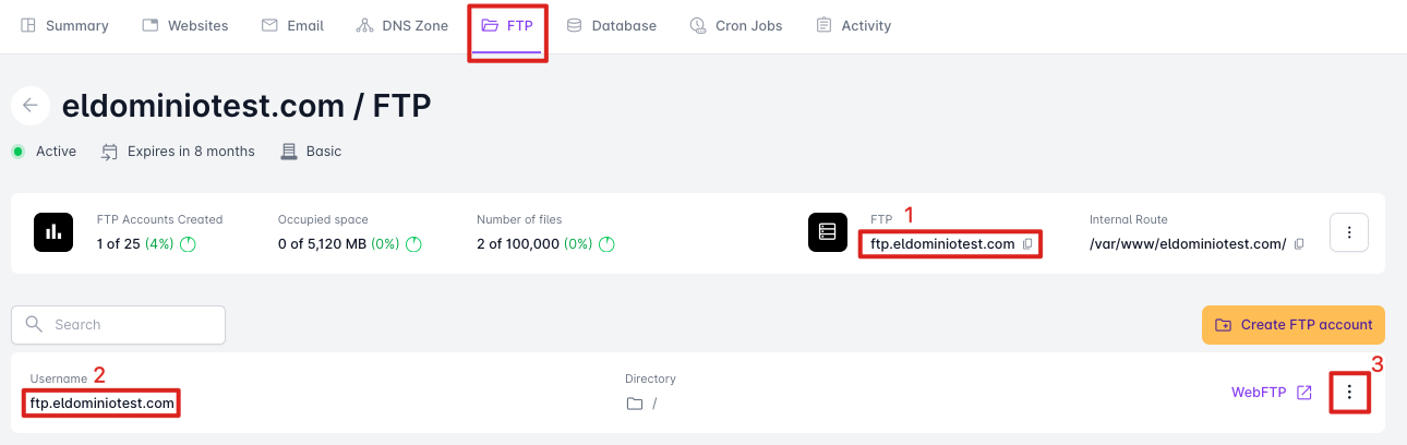 The data to access via FTP can be found in the client area, within the FTP section of the hosting management panel. To access it, from our client area, we will click on the option “Hosting y Correo” and click on the domain that has the hosting plan from which we want to export the copy. Once inside, at the top, we can access the “FTP” section.