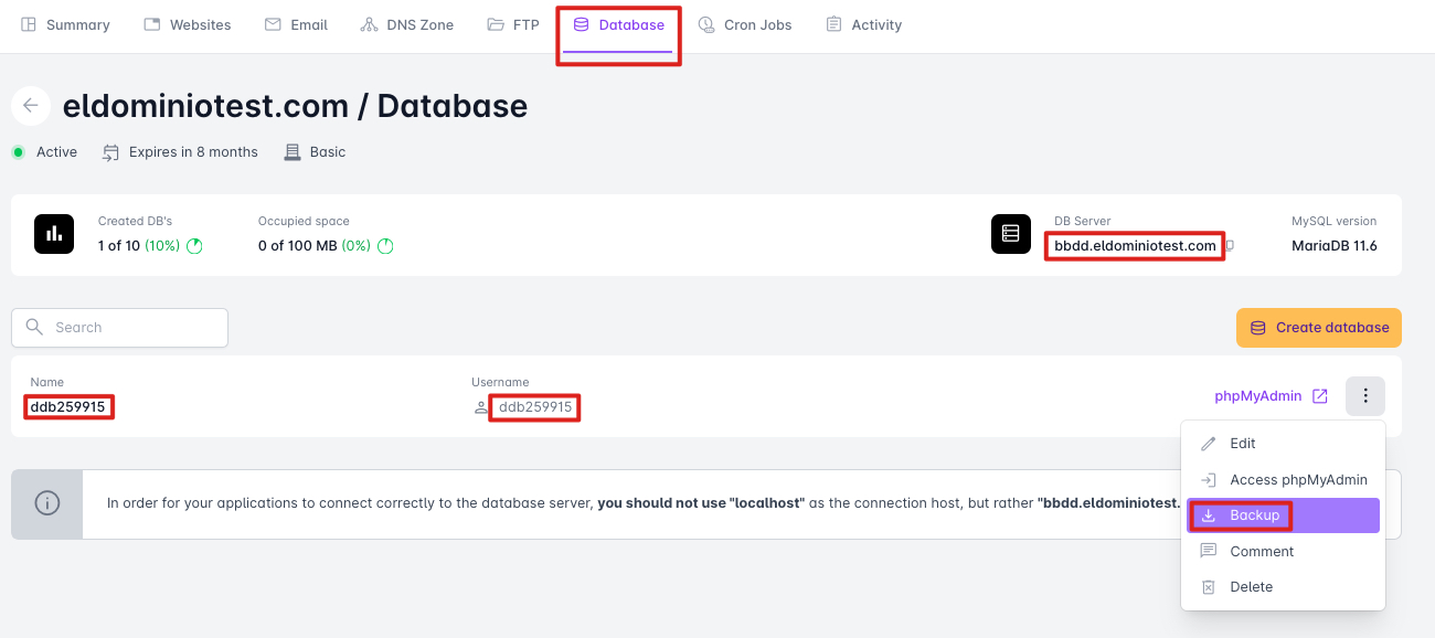 Once inside, at the top, we access the “Databases” section, and by clicking the more options button, we can choose “Backup” to download the copy in .GZ format (File format that can be decompressed to obtain the .SQL file).