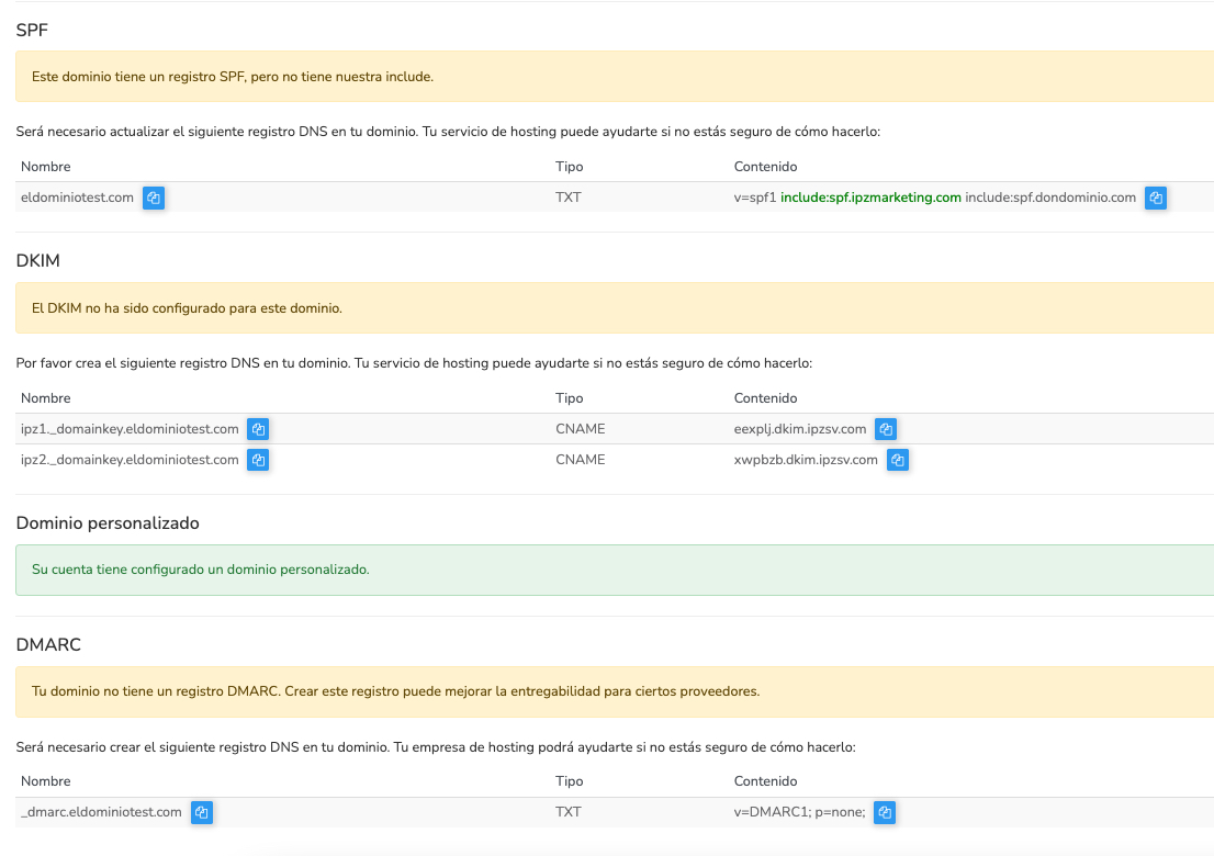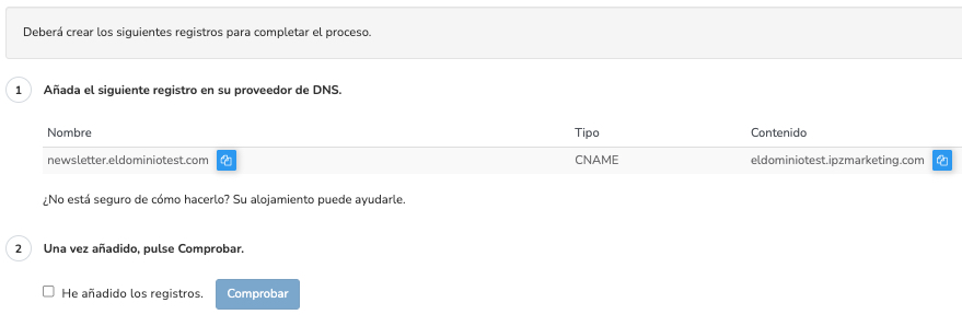 Pulsaremos el botón "Comprobar" para obtener las instrucciones de los registros que debemos añadir en la Zona DNS de nuestro dominio.