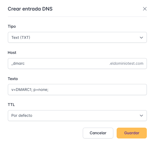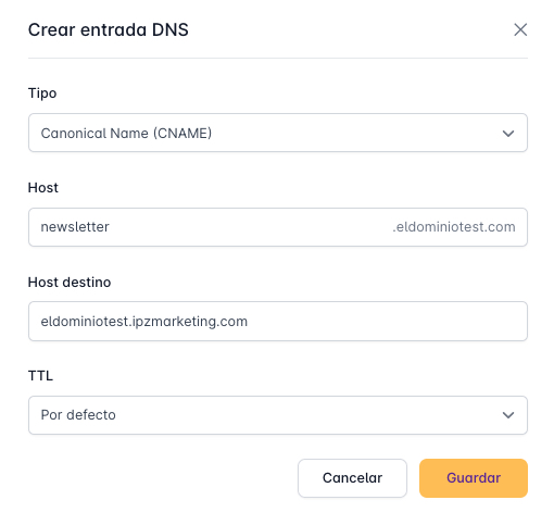 Una vez dentro, crearemos el registro DNS con los datos que nos indica en la imagen anterior: