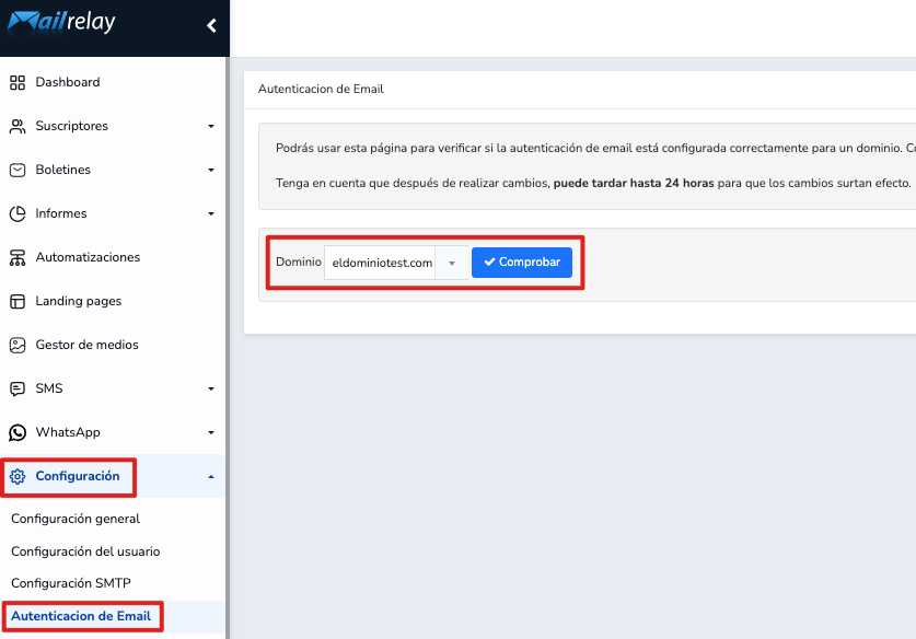 Ahora ya tenemos el dominio personalizado configurado, pero para poder enviar sin problemas, deberemos volver al panel de MailRelay, y acceder ahora al apartado "Autenticación de Email", en la sección de "Configuración" del menú lateral: