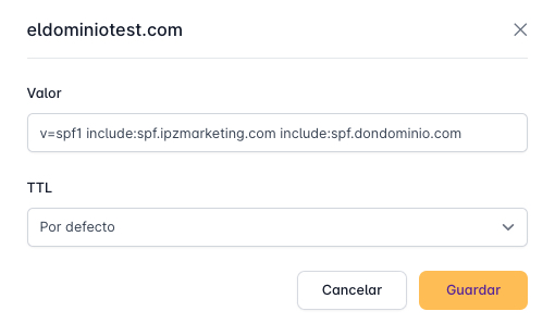 El registo SPF, ya existe, y en lugar de crear un nuevo registro, debemos identificar y "modificar" el registro, para cambiar su valor por el que nos indica MailRelay.