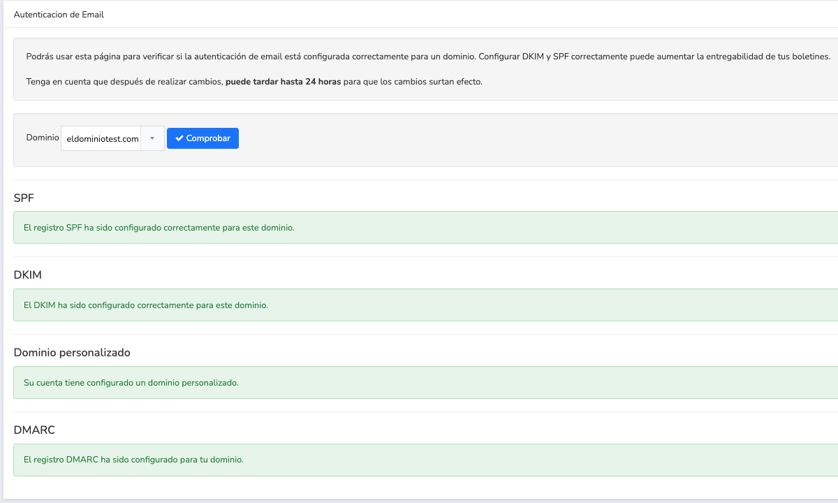Una vez hecho esto, volveremos a la página de MailRelay, y pulsaremos nuevamente en "Comprobar" y si lo hemos hecho todo correctamente, deberíamos ver la lista de la siguiente forma: